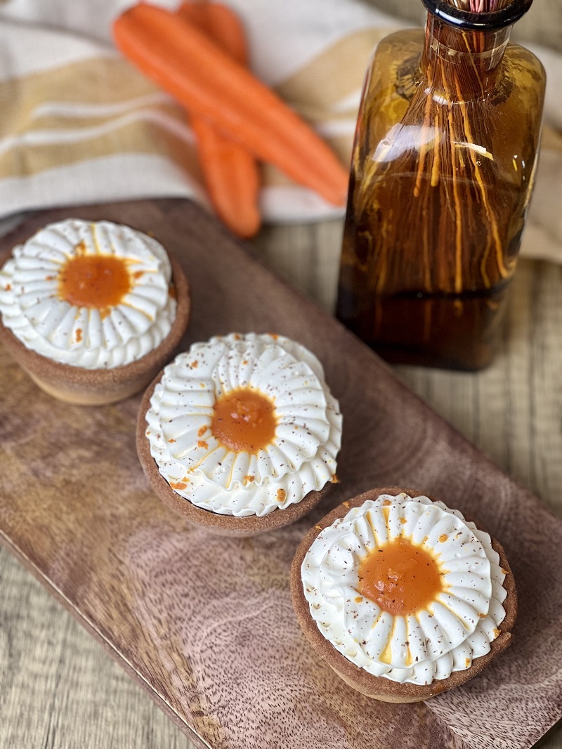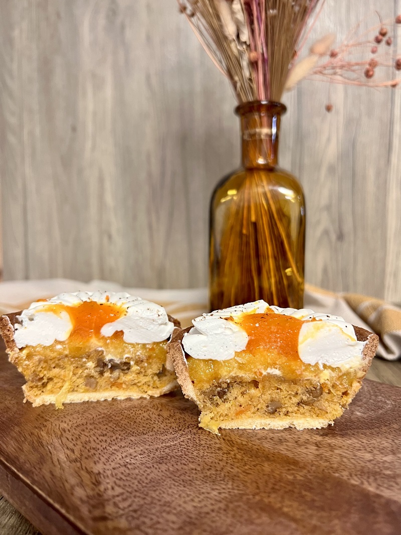 Pâte sucrée, biscuit moelleux Carrot-Cake, carottes confites, marmelade d’orange, ganache montée vanille.