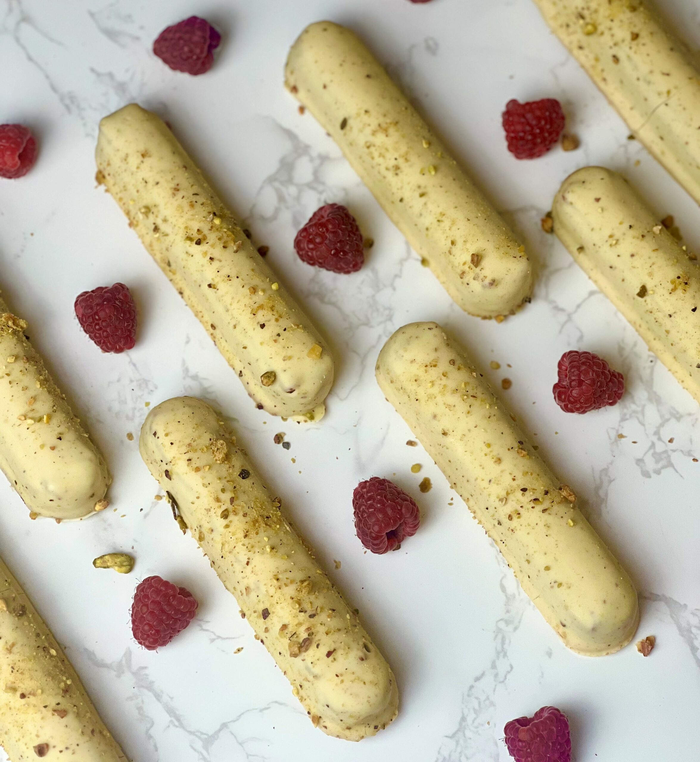 L’indémodable "pistache framboise". L’intensité d’un praliné 100% pistache mêlée à la gourmandise et l’acidité d’un gel framboise sur un sablé croquant noisette. Le tout enrobé d'une fine couche de chocolat blanc-pistache. Un duo incontournable et indétrônable pour les amoureux de la pistache et de la framboise !
