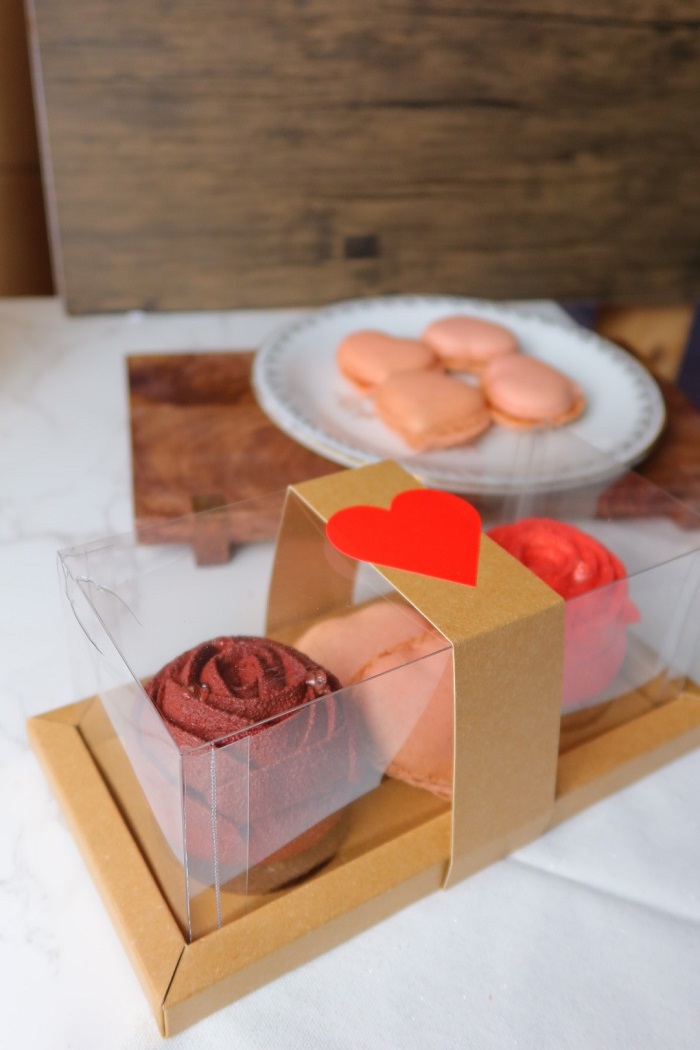 Duo de roses, rose caramel et rose framboise accompagnées de 2 macarons cœur yuzu et framboise