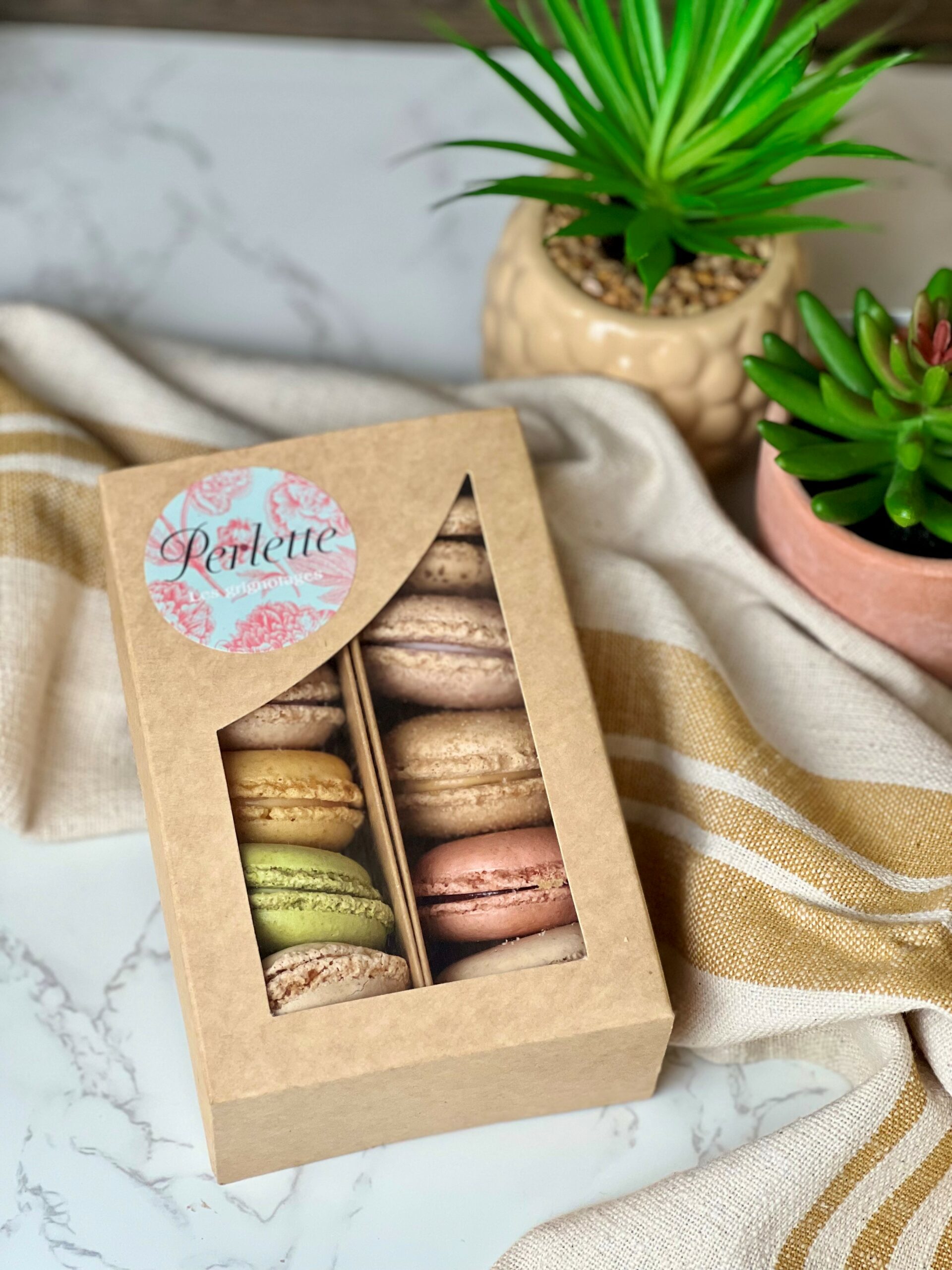 Une coque croquante qui dévoile un cœur aux parfums délicats : caramel, chocolat, vanille, pistache, framboise, citron et violette. Toute une symphonie de saveurs ! Coffret de 10 macarons : 2 macarons vanille, 2 macaron violette, 2 macarons chocolat, 1 macaron framboise, 1 macaron citron, 1 macaron pistache, 1 macaron caramel.