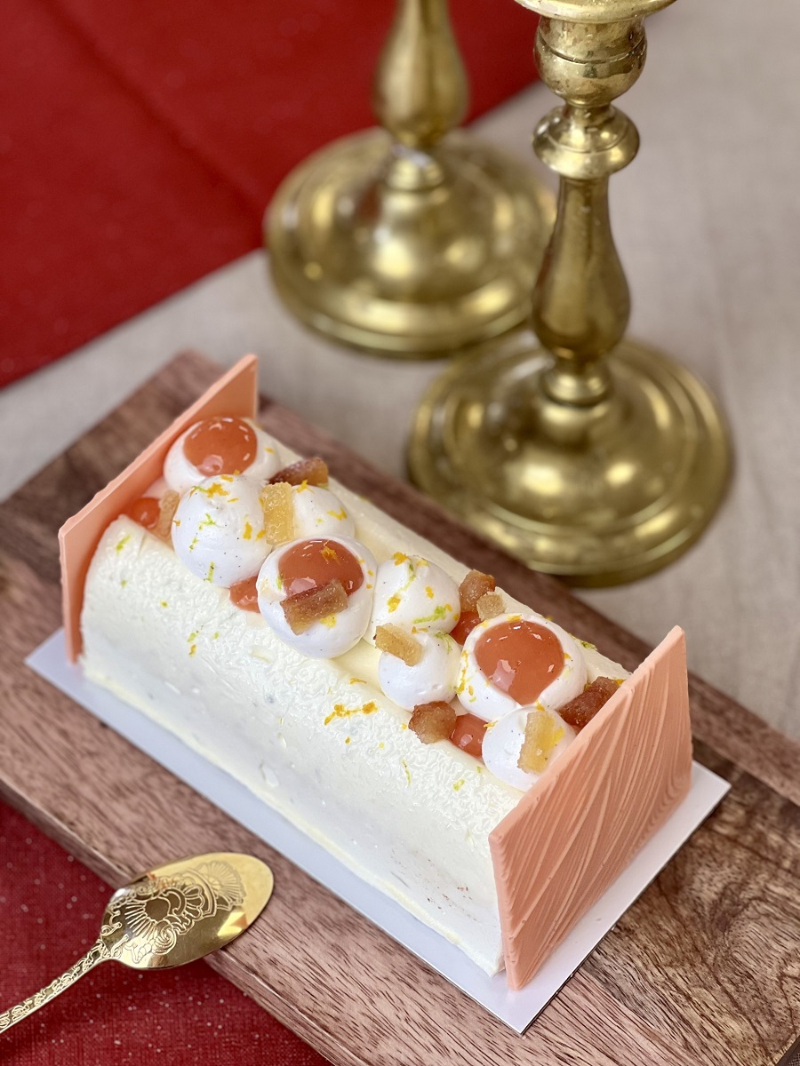 Sablé aux multi graines, biscuit citron, marmelade d’orange, mousse façon cheesecake, fruits confits citron et orange, ganache montée vanille, gel orange sanguine.