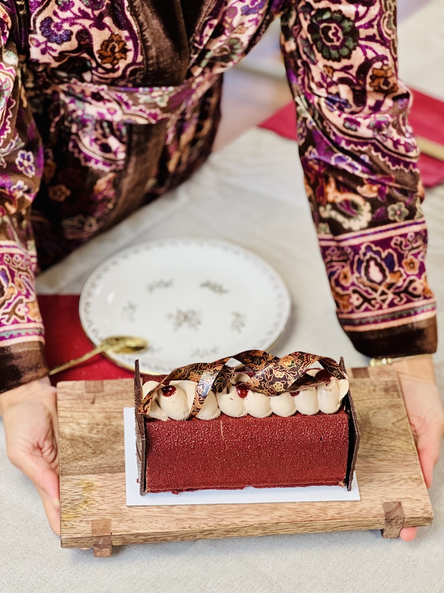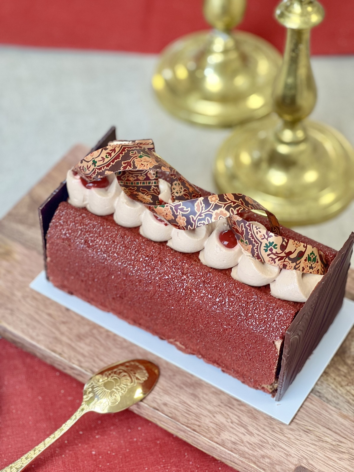 Biscuit framboise, croustillant chocolat noir, linzer framboise, crémeux chocolat noir au piment d’Espelette, mousse chocolat noir, gel léger piment framboise.
