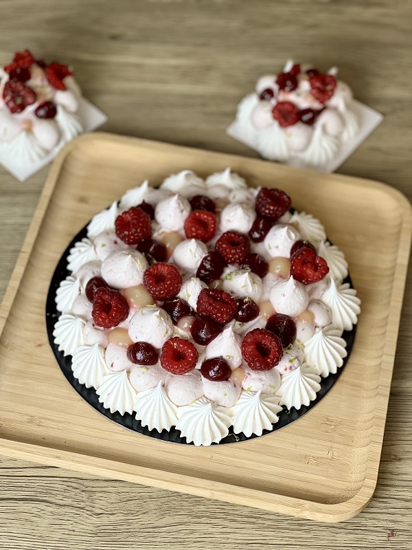 Meringues craquantes et fondantes, ganache framboise, gel framboise et citron vert, Linzer et framboises fraîches.