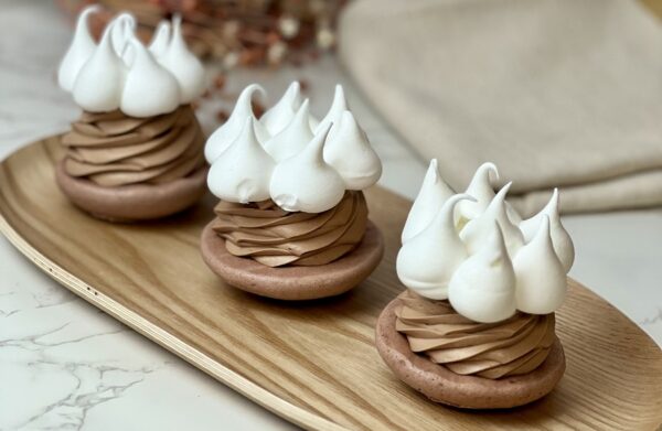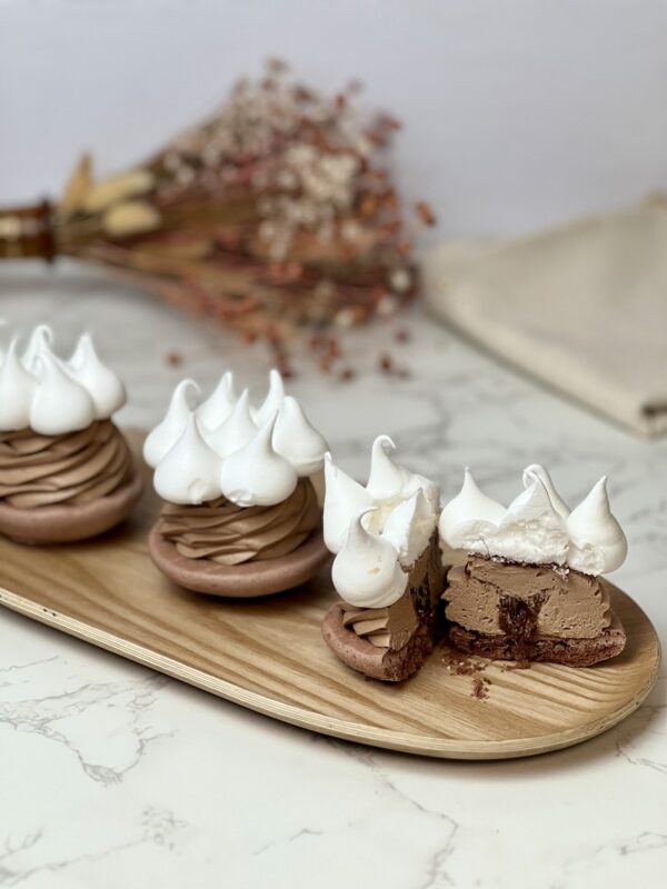 Ganache chocolat lait, praliné de grué de cacao, meringues craquantes et fondantes.