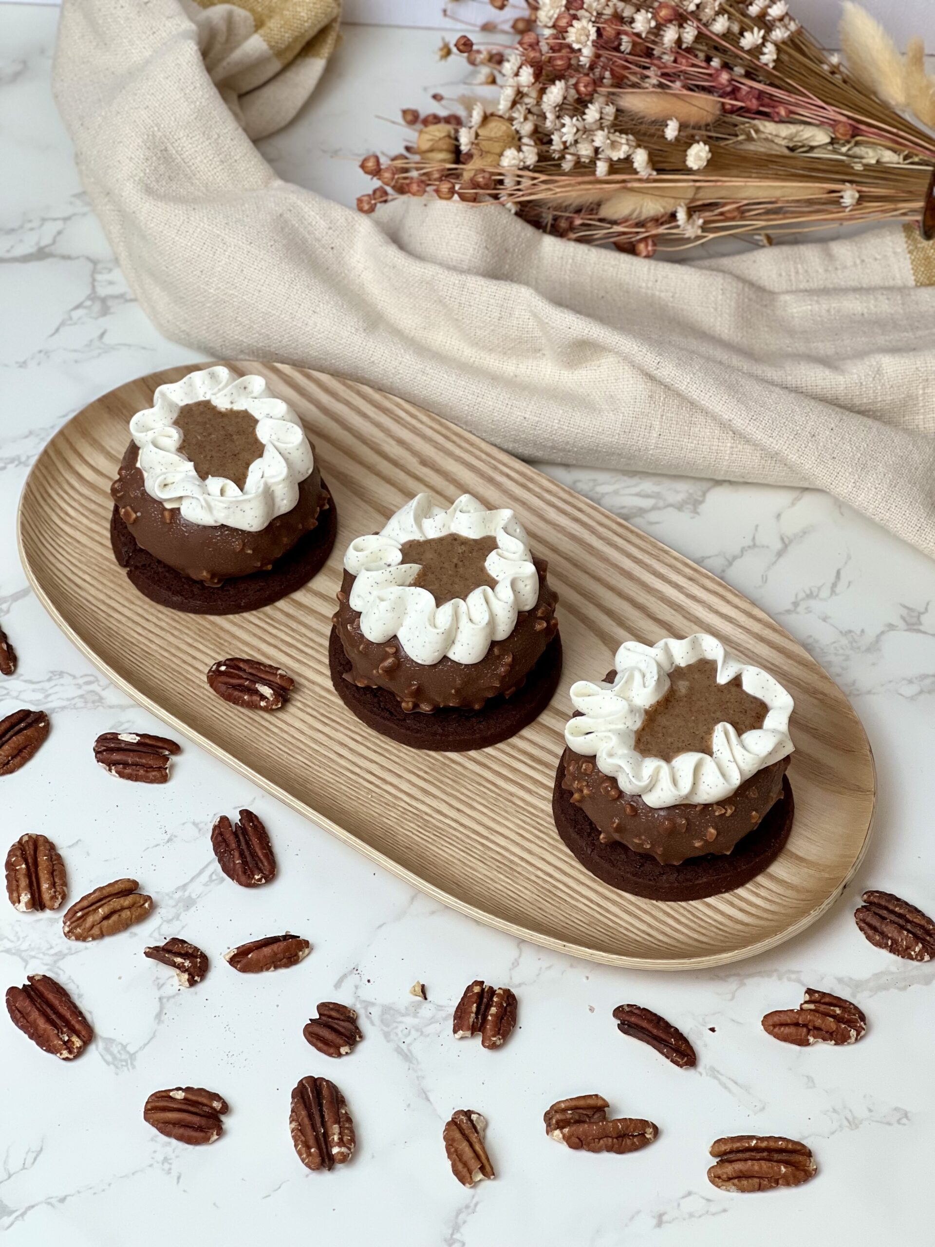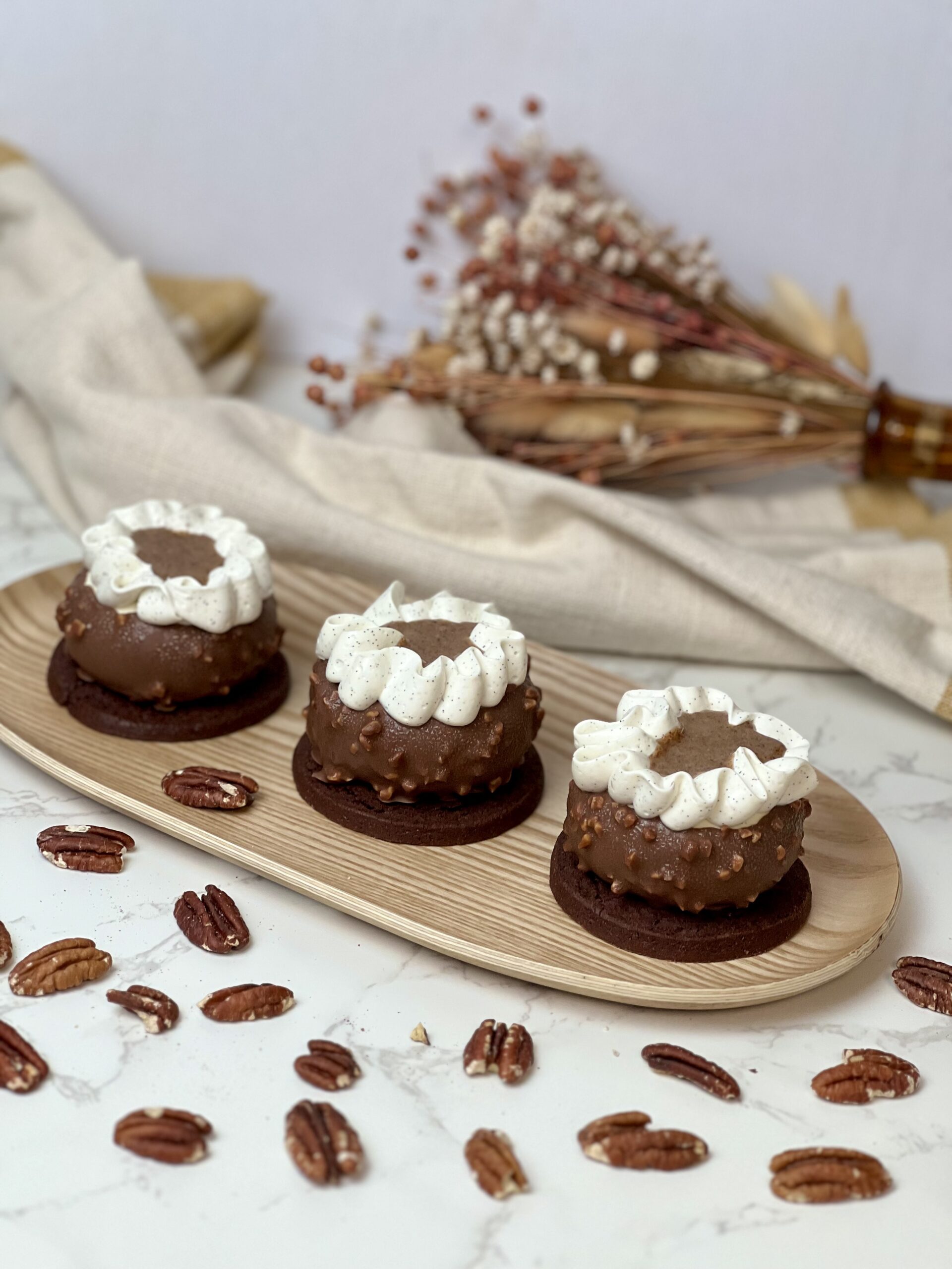 Sablé breton au chocolat et à la fleur de sel, brownie pécan, praliné pécan, bavaroise vanille, enrobage chocolat lait et amandes concassées, ganache montée vanille.
