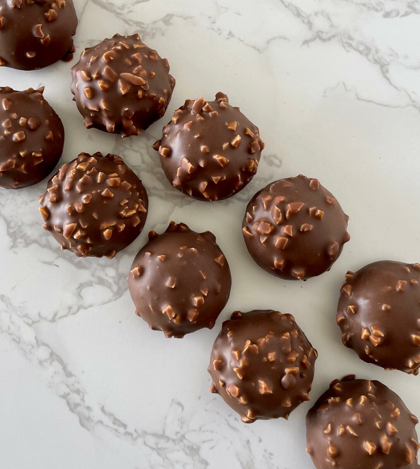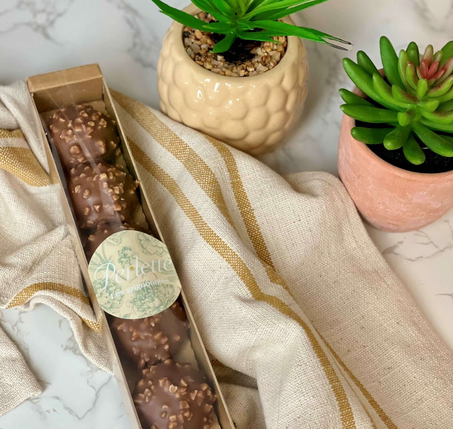 Sous la fine coque de chocolat au lait et d’amandes hachées torréfiées se cache un mélange de chocolat et de praliné amande/noisette. Pour une expérience totalement chocolatée !   Réglette de 5 rochers.